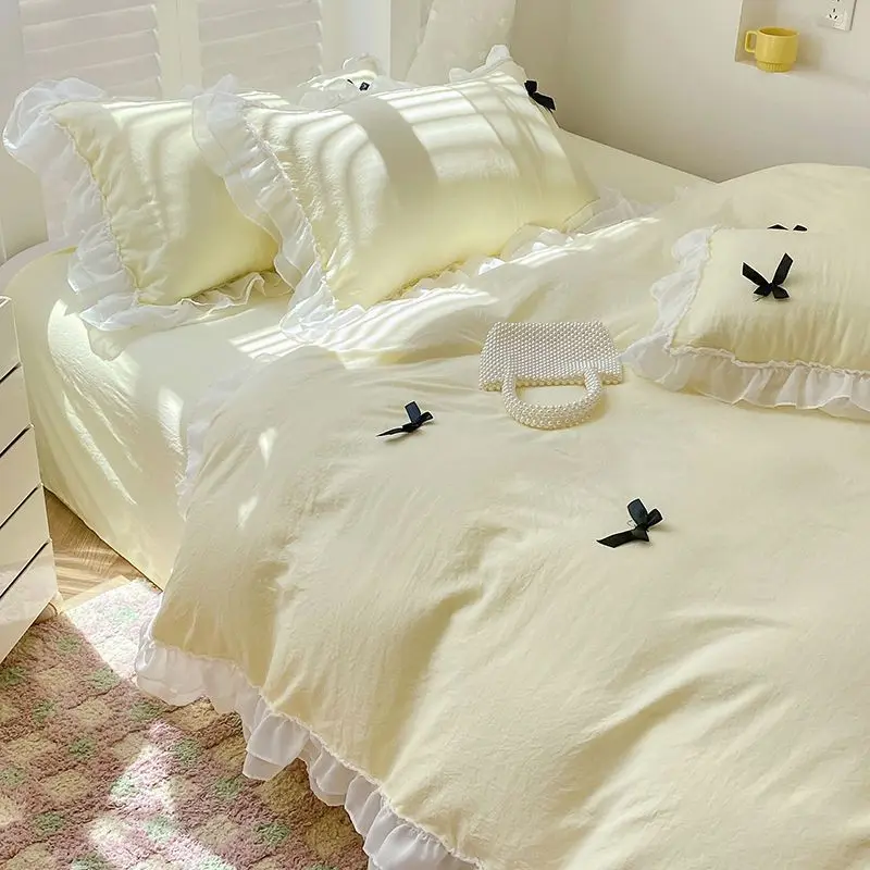 This French-inspired princess style bedding set adds elegance and charm to any bedroom. Made from soft washed cotton, it ensures a comfortable and cozy sleeping experience. The lace detailing and embroidered patterns give a luxurious and delicate look. Includes a quilt cover, bed sheet, and matching pillowcases for a complete set. Perfect for girls’ bedrooms or themed rooms with a girly aesthetic. The heart and bow designs add playful and whimsical touches. Durable construction maintains vibrant colors and intricate embroidery even after multiple washes. Available in both three-piece and four-piece options to suit your needs. Lightweight and breathable, it keeps sleepers comfortable throughout the night. Elevate your bedroom décor with this stylish and elegant princess bedding set.